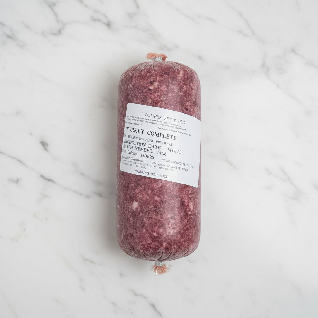 Turkey (approx. 80% muscle meat, 10% bone, 10% offal). Note: Offal is often beef or lamb across Bulmers recipes.