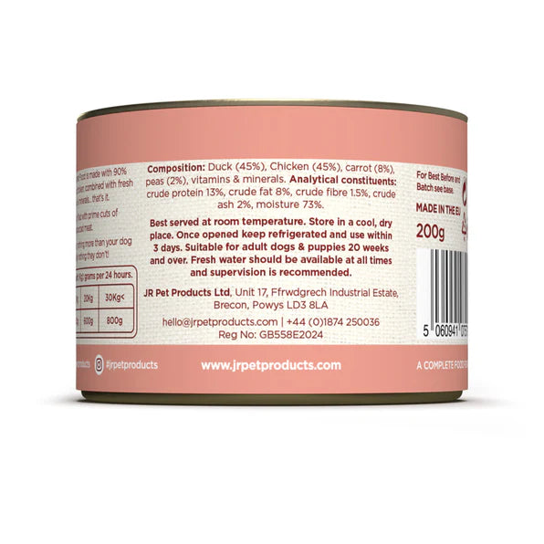 Most “grain-free” wet foods still throw potato, gums or bulkers in the tin. JR doesn’t. This recipe is pure duck and chicken, a touch of veg, and essential vitamins/minerals — nothing more.