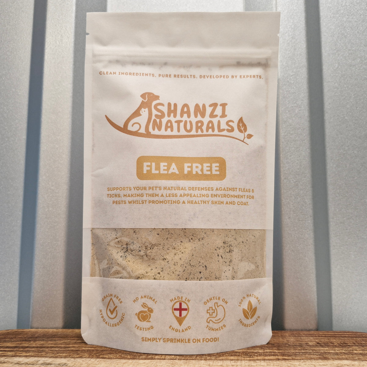 Shanzi Naturals Flea Free is a natural, herbal powder formulated to support your pet's natural defences against fleas and ticks. It harnesses the power of specific ingredients traditionally known for their pest-repelling properties, working together to make your pet a less appealing host for these pesky parasites, while also promoting healthy skin and coat.
