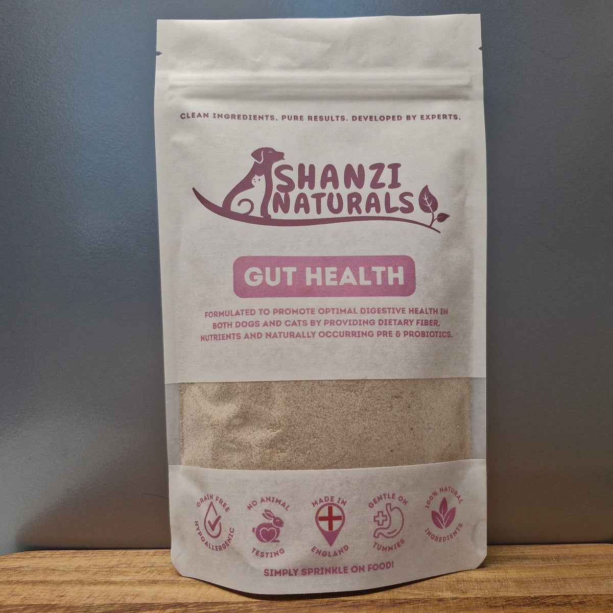 Shanzi Naturals Gut Health Powder is a simple, effective blend designed to support healthy digestion, balanced gut flora, and normal bowel movements in dogs and cats. It combines fibre, nutrients, and traditional digestive herbs to gently maintain gut function — ideal for pets with sensitive stomachs, dietary changes, or occasional digestive upset.