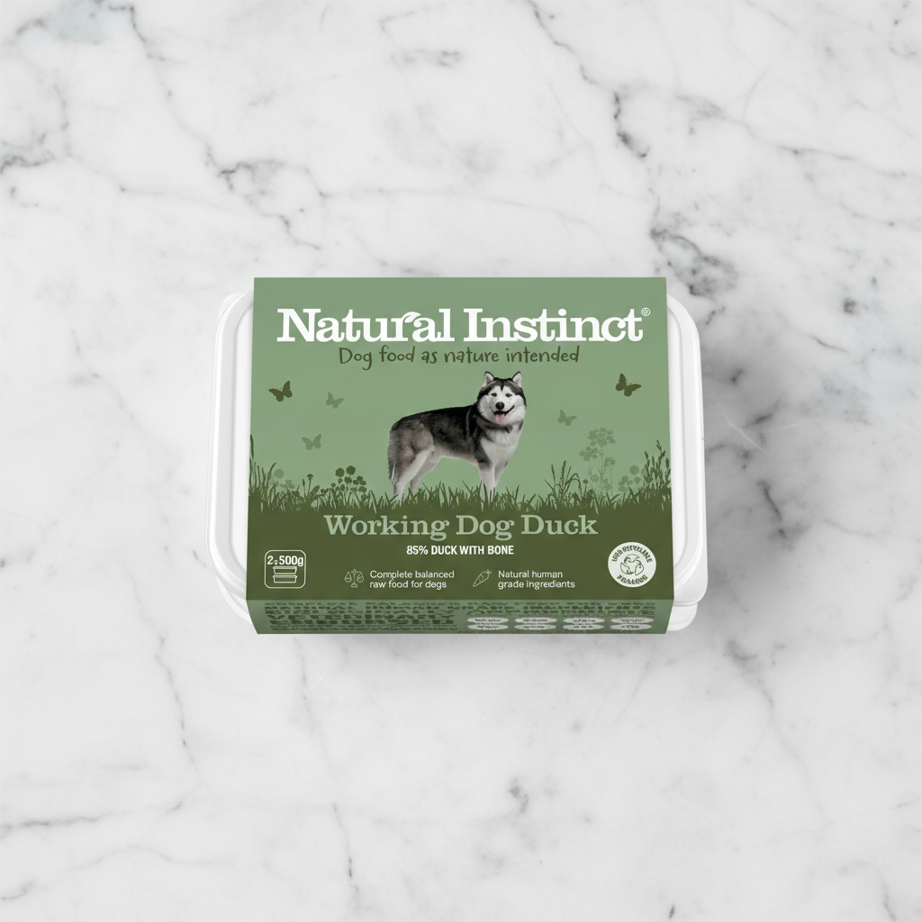 Natural Instinct Duck (Working Dog) is a single-protein, FEDIAF complete raw recipe available in 2 × 500 g tubs (1 kg total) and 1 kg tubs. Formulated with 85% duck with bone plus vegetables, fruit, kelp, salmon oil and added vitamin C. Vet approved, DEFRA regulated, and made using human-grade ingredients — ideal for elimination diets or dogs that do best on one protein.